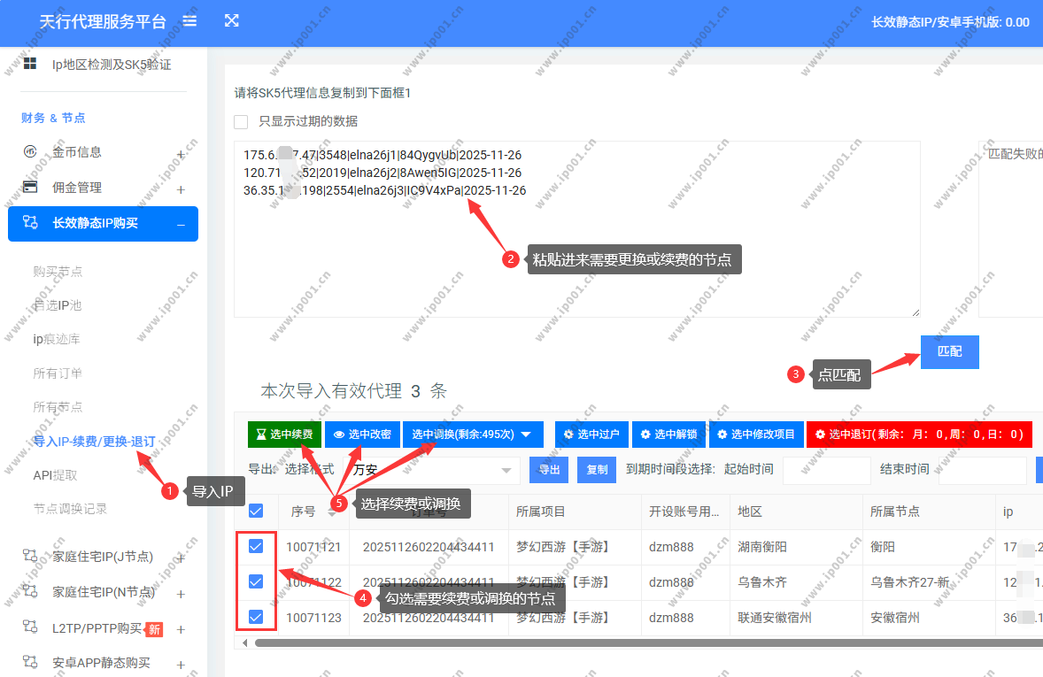 找到已购套餐 → 点击导入IP → 粘贴节点信息 → 点击匹配 → 勾选目标节点 → 选择续费/更换/改密等 → 完成操作。