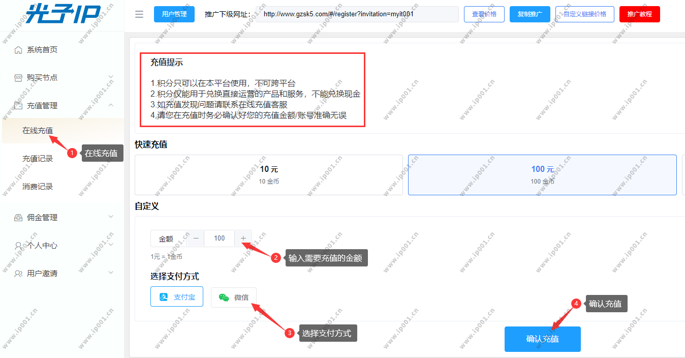 点击充值管理 → 在线充值 → 输入金额 → 选择支付方式 → 确认充值。 💡 注意:金币只能购买本平台产品,金币不支持提现,请根据实际需求充值